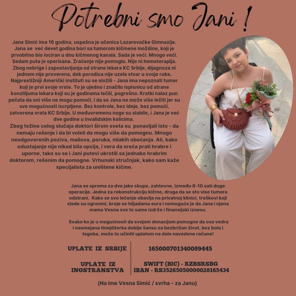 Потребни смо нашој другарици Јани Симић! Укључите се у што већем броју и подржите хуманитарни базар за Јану!