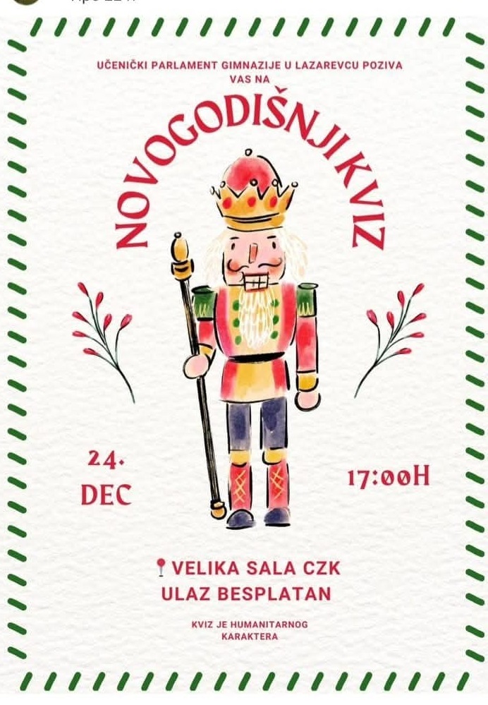 У организацији Ученичког парламента Гимназије у Лазаревцу 24.12.2025. године у великој сали Центра за културу Лазаревац са почетком у 17 часова биће одржан Новогодишњи квиз . Квиз је хуманитарног карактера.